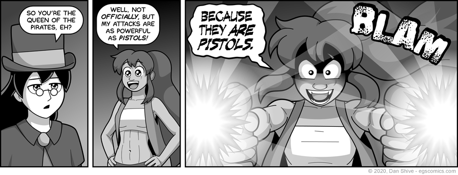 EDIT: Ye gods, I keep forgetting to mention this. Grace's outfit and her "queen of the pirates" thing is a reference to the Manga / Anime One Piece and its main character, Luffy. This same character as a kid claimed their punches would be as powerful as pistols one day.