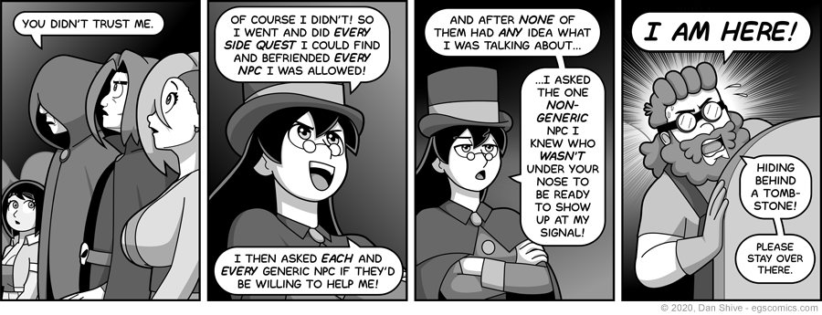 Panel four didn't start out as an intentional My Hero Academia reference ("I am here" is the catchphrase of a main character, and appending a description to it a recurring joke), but then I realized what I had written, considered who was saying it, and it became an INTENTIONAL My Hero Academia reference, darn it!