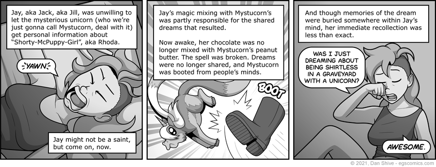 I suppose I could have left it a mysterious mystery why Jay said "no" and ended the dream, but honestly, I didn't intend for it to be mysterious. A creepy unicorn was about to get Rhoda's name in the hopes of finding her again outside the dream. Jay did not approve.