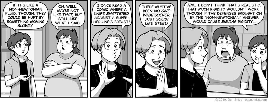 I haven't seen that exact scenario in an actual comic book, but I have seen things that have lead to similar conclusions, or simple bafflement, such as a guy of presumably normal strength trying to stab someone with a sai (aka Raphael the Ninja Turtle's weapon) only for the sai to bend in a manner conforming to the person's body, and... I mean, how?