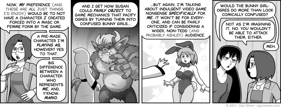 I hadn't planned to do a direct follow-up to the previous comic, but I saw an opinion that got me thinking about whether I would want a character I created getting transformed like that, and my answer was no. I see a difference in it happening to a character I happen to be controlling, and a character I might consider as representing me.