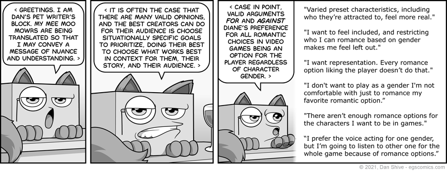 I really wanted to show some of the places people were coming from with their opinions on romantic options in games, and how fair and valid they all are. I didn't think I could really get these across with Diane and Tedd, hence the block stepping in.