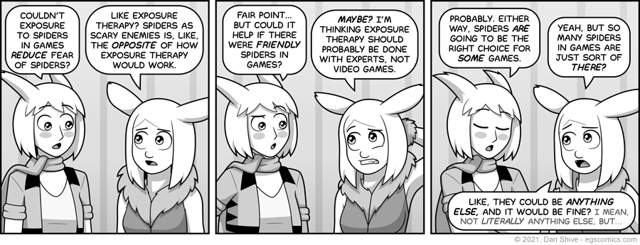 Bottom-line, spiders being enemies in games invalidates any sort of "exposure therapy" argument. It's not going to cure anyone of their phobia.