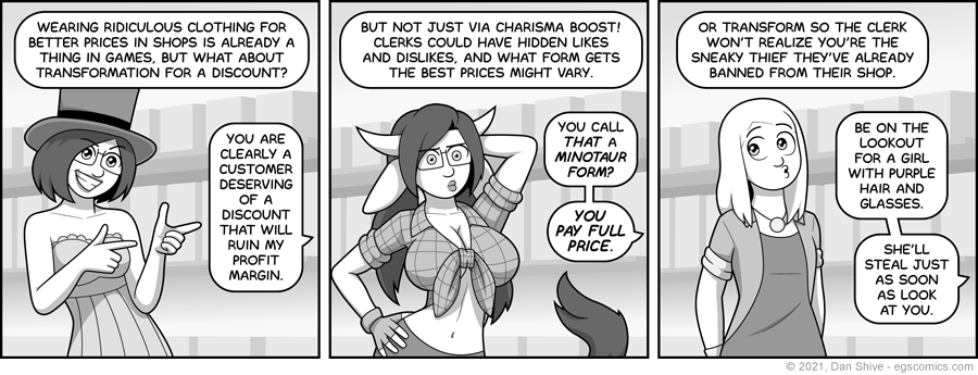 I like the idea in panel two IN THEORY, at least. The way I'd run between shops in some games makes me think I'd get sick of morphing in unique ways before entering every store. I do like the idea of benefiting from knowing things unique to NPCs you're interacting with, however.