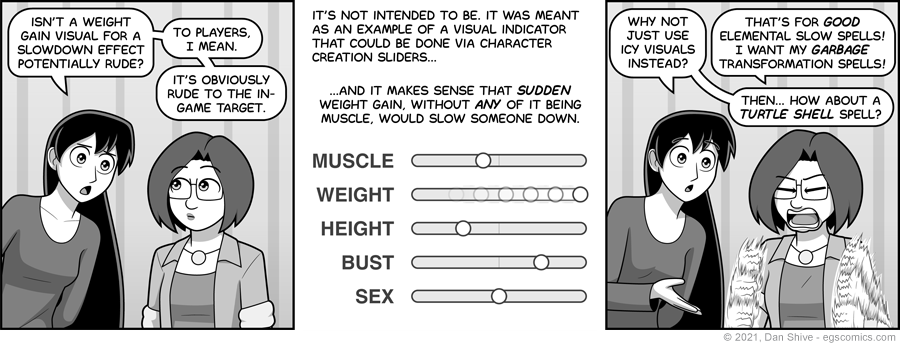 Speaking of the sliders, height change would be another option for slowing down enemies, and I believe shrinking was even mentioned as a way to slow them down earlier. I didn't consider it for the previous comic, however, because I was thinking of changes that would affect a single variable, and I think a significant height reduction would affect more than just movement speed.