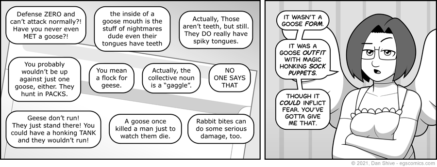 But yeah, geese are not to be messed with. I just thought a honking outfit with such weird effects would be funny, and wasn't considering what actual geese would be like beyond the sound, the fear effect (acknowledgement of their danger!), and how some people seem to really, really not like geese (the aggression).