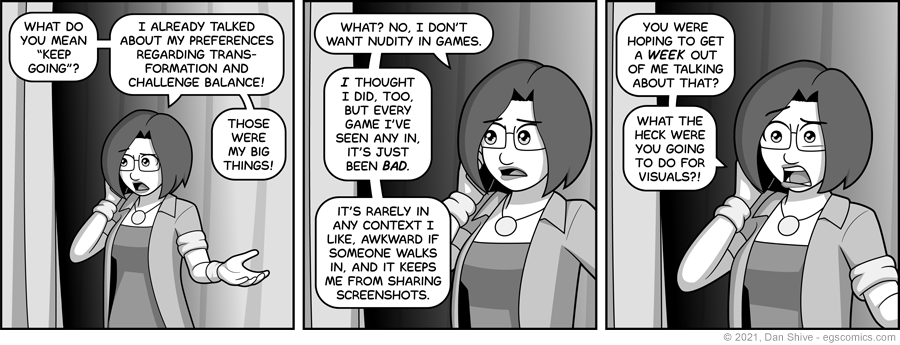 Just to reiterate, all of these have been subjective views about what I and/or the characters would personally enjoy and/or prefer in video games. This is not suggesting all games should do these things.
