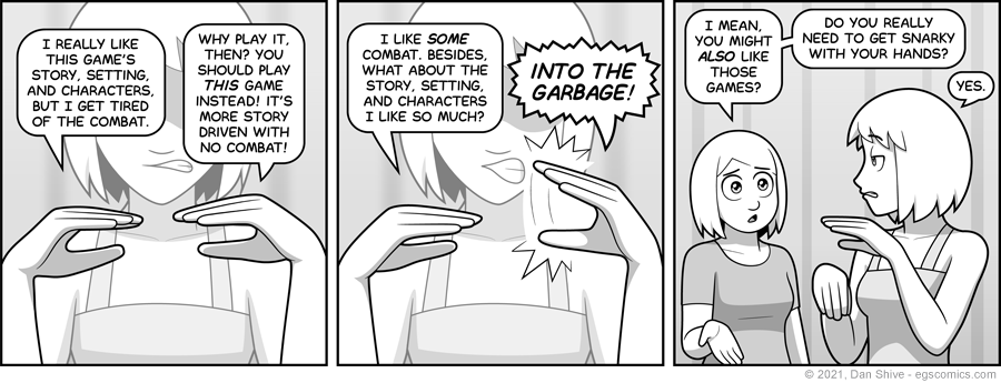 I don't think it's strange to like the idea of lessening the impact of the parts I didn't care for, and that's all these comics are about. Things I (and my characters) would like. They are not demands, they're not anything anyone has to agree with or implement in their games, they're just things we would happen to like.