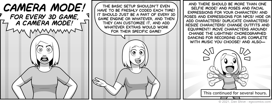 But yeah, camera modes are good, and for all I know, what Sarah suggests in panel two is already a thing, because it's becoming more and more common of a thing.