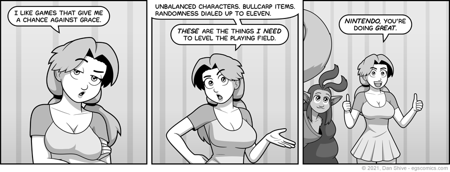 I didn't write backwards from the third panel on this one to intentionally make a Nintendo joke. I just though that Ellen would like games in which she'd have an increased chance of winning against Grace, and once I started listing ways to make that happen, well...