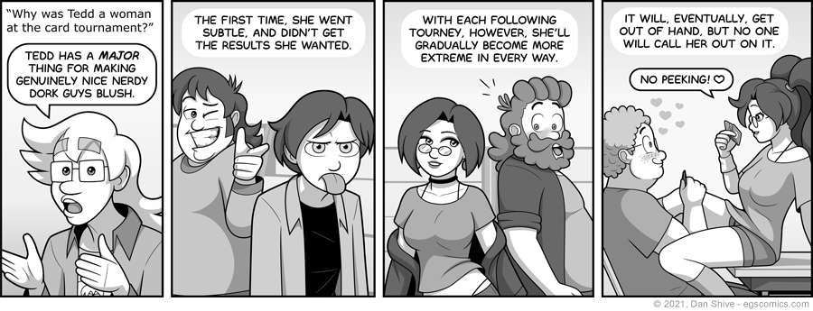 ANYWAY, I didn't want Larry's answer to imply he hadn't grown or learned anything, which is one reason why "genuinely" is in the first panel, and Larry isn't in the last two panels. While Larry would definitely want to be a recipient of attention if Tedd acted this way, I was more comfortable having characters other than the person answering the question in those panels.
