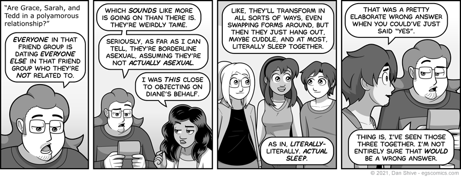 This isn't me trying not to lean in too hard to not having too many "interesting" visuals. I think all of them dating in an absurdly wholesome manner that confuses others was the second most interesting available answer, and it's also a nod to many, may comments from readers over the years about how "tame" everyone in this comic actually is in regard to stuff like this.