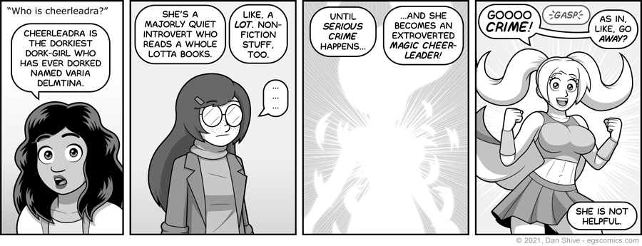 Speaking of Daria, I wasn't sure whether to change Varia's hair color in the last panel, and ultimately decided to do so in order to effectively reference Brittany, a cheerleader in Daria.