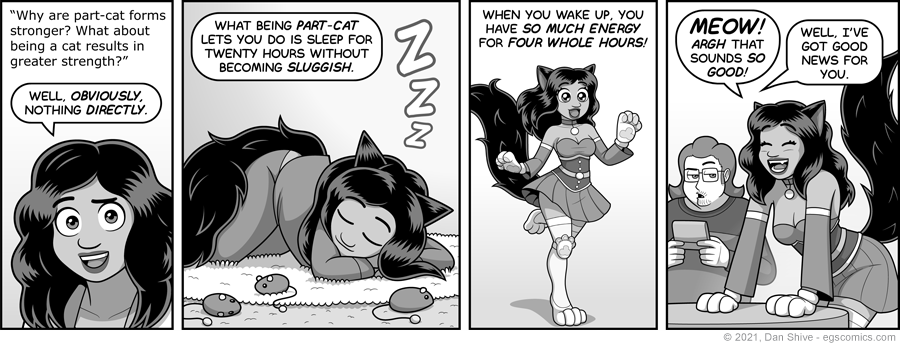 As for why the elaborate costume, I wanted Rhea's cat form to come with an outfit change, and I didn't want it to just be a generic one piece swimsuit with a collar or something (which I've admittedly had characters wear in the past.