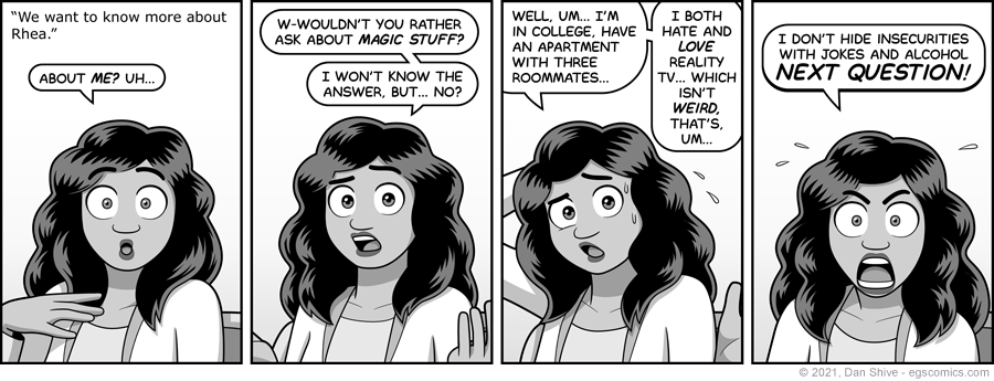 This wasn't technically asked, given that it's also not technically a question, but it's a view that had been expressed. It was also expressed about Luke and Larry, but their personalities have been more obviously explored during this. Rhea, meanwhile, has mostly had her emotional shields up, so I thought this slight glimpse beyond those shields might be interesting.