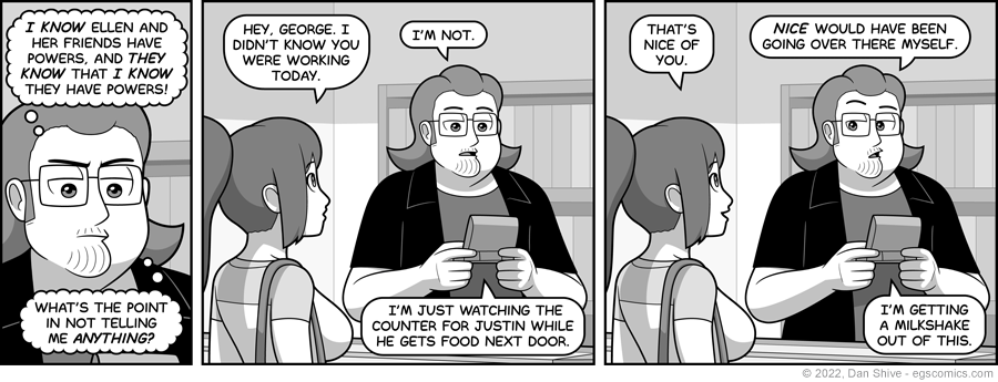 So now we get two panels devoted to the simple idea of "when Justin's not on-panel, everyone should be asking 'where's Justin?'", and establishing that George is not, in fact, on the clock.