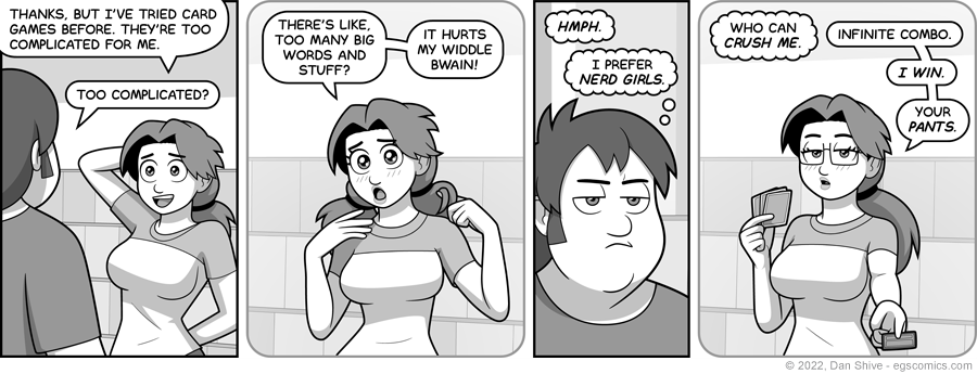 As originally imagined, Rich would react to Ellen saying card games are too complicated by thinking for a moment, then saying "I prefer Velma to Daphne" to himself. This would confuse Ellen and Larry, each of them failing to pick up on the context.