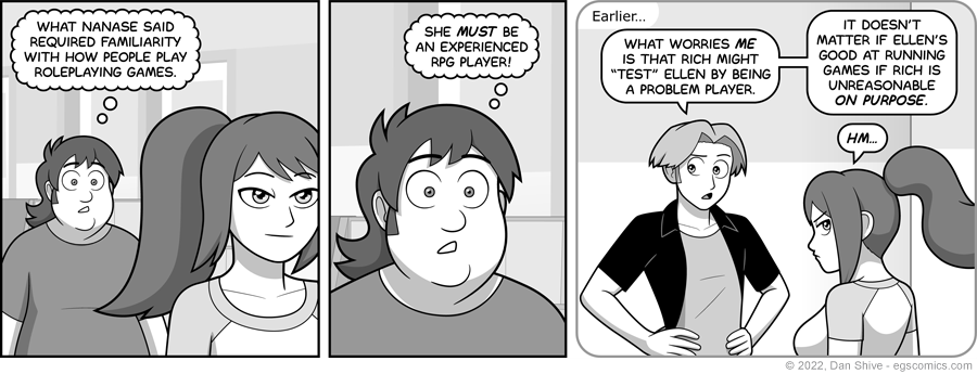 I didn't think of Nanase acting too familiar with RPG player types before I started work on the previous comic, but I did think of that while working on it. Nanase was showing an odd familiarity with Table Top RPG players without being a player, or an observer of others players.