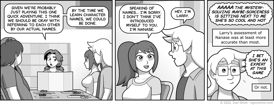 That's how I decided on the seating arrangement. Will I regret this later based purely on who talks to whom when? It's possible, but I'll stand by it in any case because the in-universe logic is more important than panel layouts.