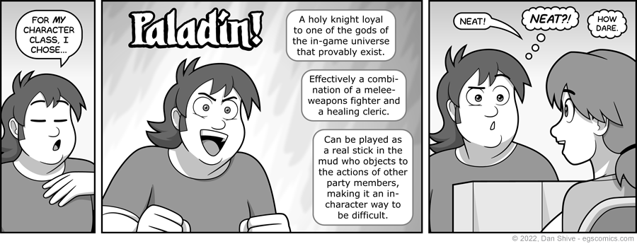 I should point out that nobody HAS to play their paladins as sticks in the mud. At least, not in most games. I've heard some games, or editions of games, had it so paladins could lose their fancy powers if other people in their party did things their god(s) wouldn't approve of, so...
