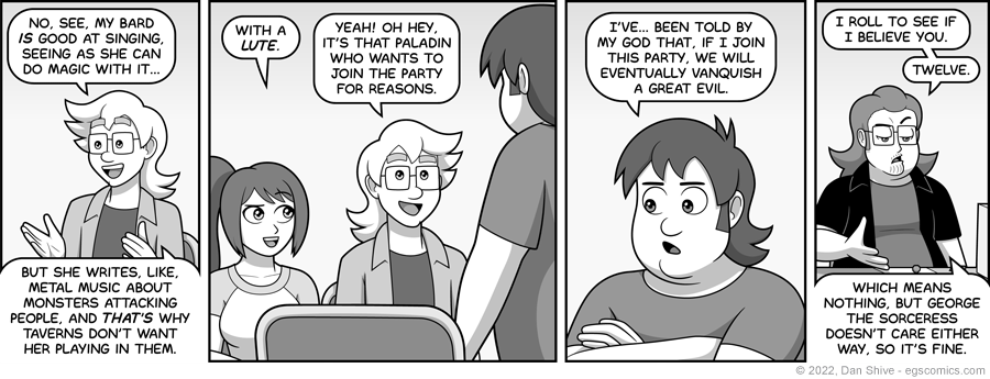 I'm mildly curious how many people reacted to "I roll to see if I believe you" with strong disapproval before reading the rest of the panel, because no, RPGs do not work that way with player characters.