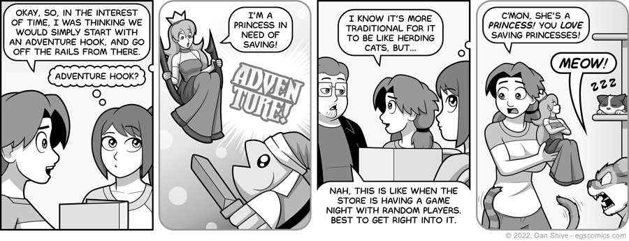 The idea in the first panel is that the players go along with the adventure hook to a point, effectively starting an adventure, then they can do whatever.