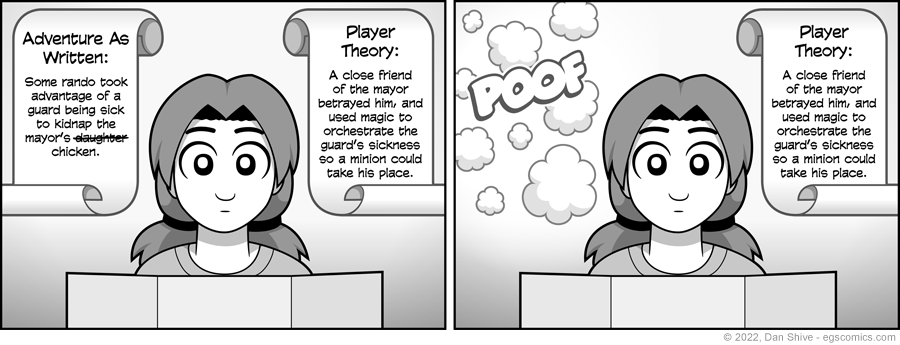 In a shocking twist, the one who was kidnapped in the original sample adventure was NOT a chicken.
