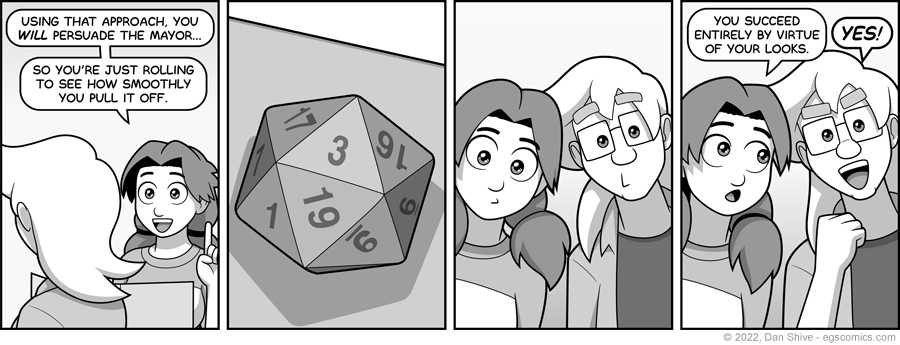 In any case, I just like that visual of them staring down at the dice, so physical laws of reality be darned.