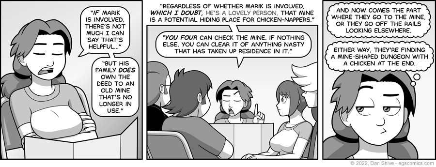 You're going to find a dungeon that matches the layout of an abandoned mine, and there's going to be a chicken in there.