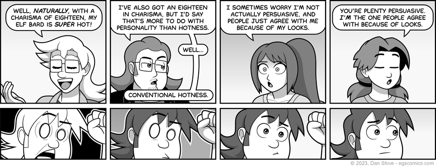George is willing to admit that his sorceress, who actually resembles George, does not fit with common societal expectations of hotness in Moperville, but he will not go so far as to say that his sorceress is not hot.