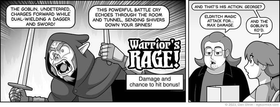 I felt like any actual number I could give here might seem too low or too high (either for the attack damage, or for the goblin's implied health), so I went with "max damage."