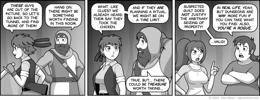 With infinite panel space and time, I would have liked to have had a nervous-looking Elf Larry in the background of the third panel with the loot from their earlier natural twenty.