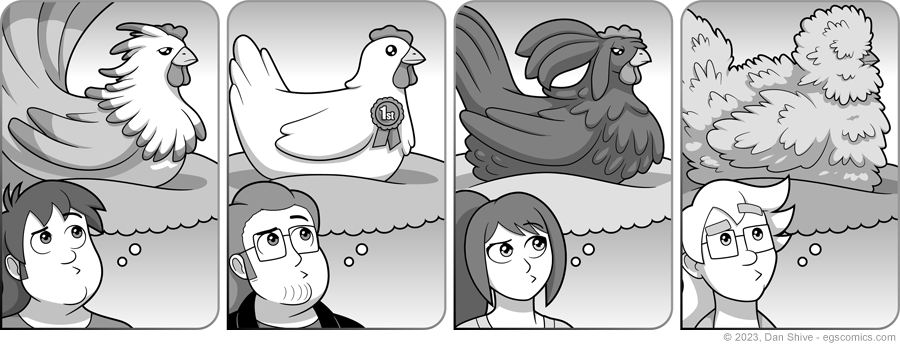 A while ago, I jokingly panicked over having to eventually draw a fancy chicken. Little did past me know, however, that I'd have to draw FOUR fancy chickens!