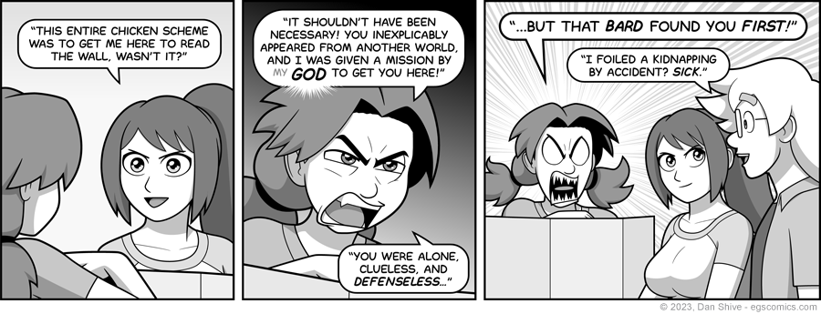 And then, before you know it? There's like, a dozen things they can't avoid having to work around, and now someone has to steal a chicken.