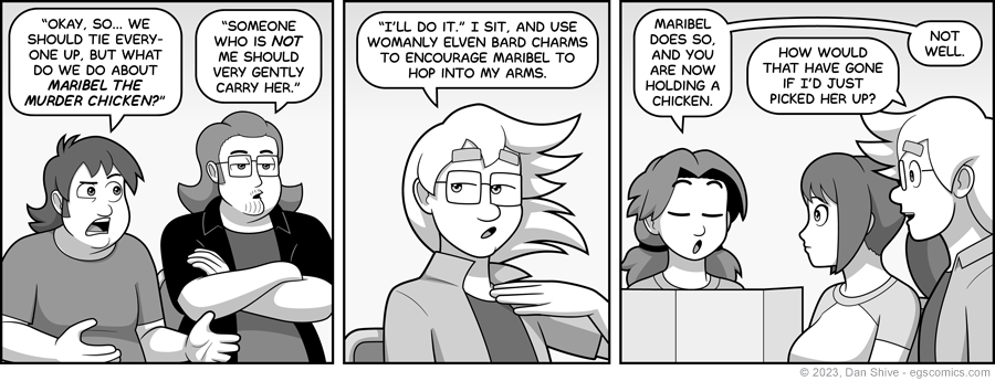 "It's a stereotype that all elves are into nature and animals, but I'm willing to take advantage of the chicken's prejudices for the sake of the mission."