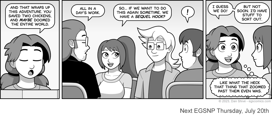 I'm pushing the next EGSNP to Thursday, July 20th. I want to wrap this storyline up properly, and I find I need to make a couple of decisions on how exactly I want to do that.