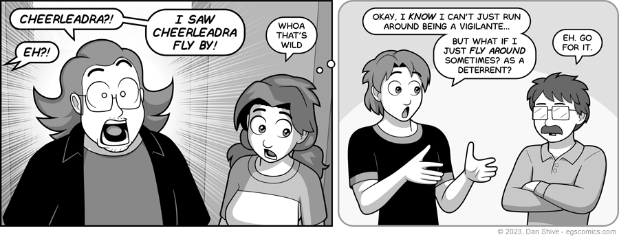 And so the big, amazing reason that Cheerleadra is flying around IS... Trying to prevent crime simply by existing.