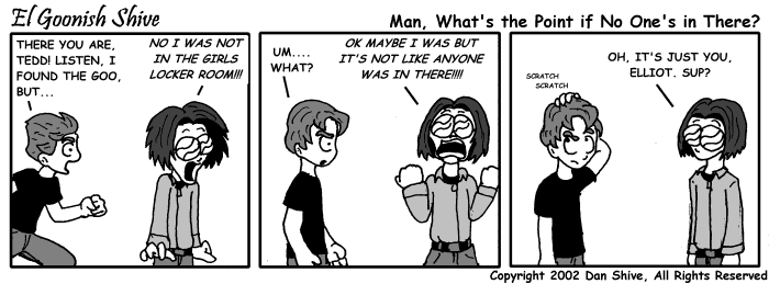 Seriously, I was grasping at straws like “at least this confirms that Tedd actually has a mouth”, but no, he opened it in earlier comics. All this comic does is very clearly imply that Tedd was in the girls locker room. How did he even get in there? Don’t they lock the doors after school?