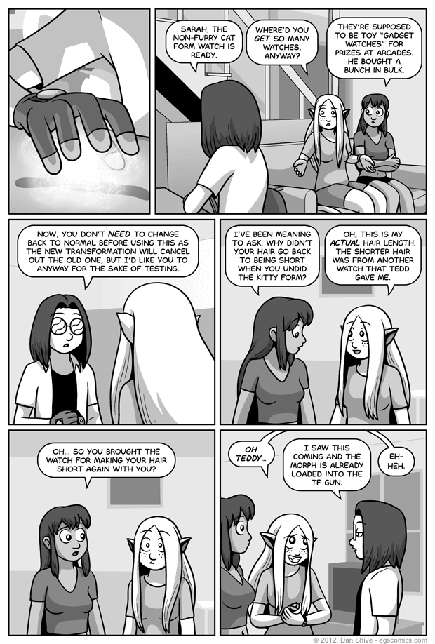 - The glove- Hair growth- "Not an enchantment"- Sarah and the watch- Barely visible, but the glove again- "Undid the kitty form"Given the number of messages I'd received about Sarah's hair not going back to being short, the fact that I wanted to show the glove being used, AND a desire to address where the heck Tedd got a bunch of watch-like not-watches, this comic now exists. HUZZAH!