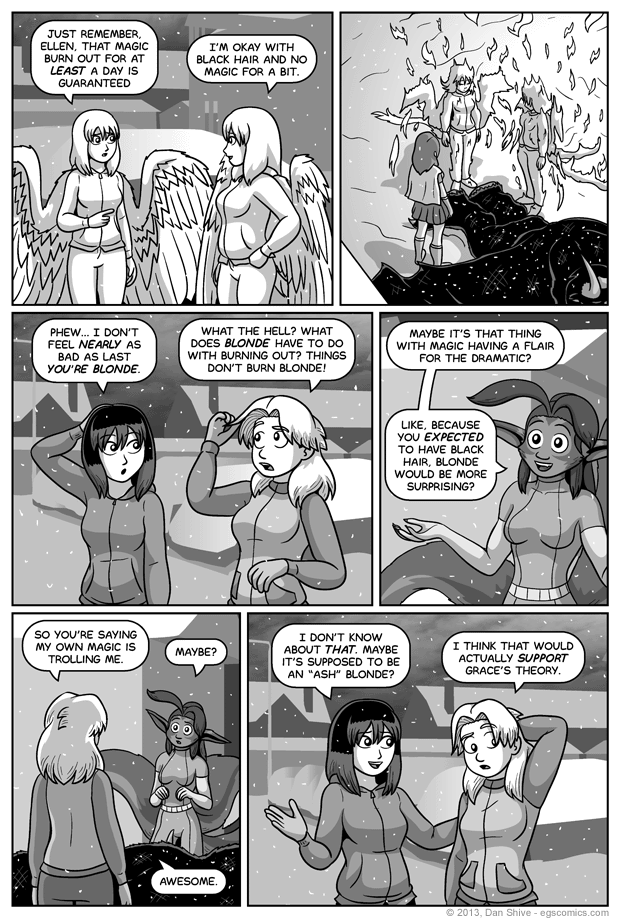 Because of that, I actually decided on Ellen's hair turning blonde while burned out prior to coming up with a reason for why it would. I thought about it for a bit, and the last three panels of this comic are at least part of the result.