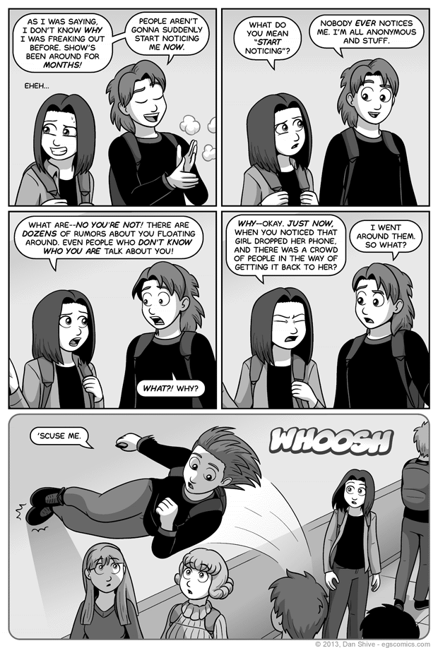 This is one of those comics where I thought of it in my head and was all like "yay!" Then it came time to actually make it, and I was all like "I have to draw Elliot getting past people by running on a wall? Whose idea was that?!"
