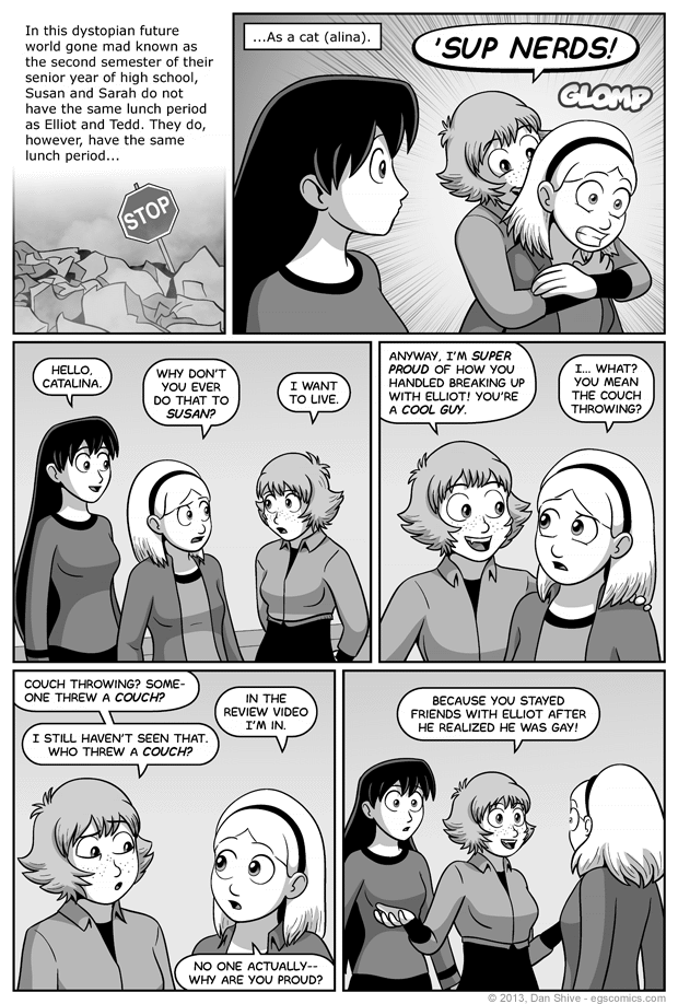 Sarah and Susan not having the same lunch period as Elliot and Tedd is what I was referring to.  The idea that they'd all just wind up having the same lunch period is something I think most would take for granted, but my old high school had three separate lunch periods, and their school is the same way. The only thing keeping the odds in their favor was comic plot convenience, AND THAT HAS TURNED AGAINST THEM.