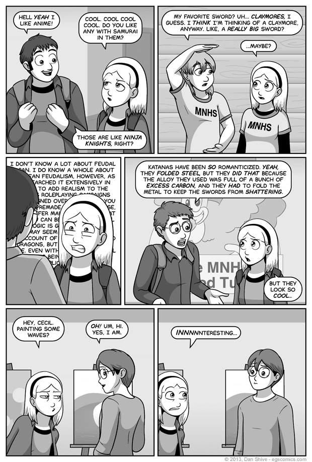 It is my undertanding that what that guy in panel four is saying about historical katanas is accurate. I, however, am not an expert swordsmith, and perhaps I, by which I mean, HE, is mistaken in some regard. If so, I might have to write in a joke somewhere down the line that points out whatever that mistake was, because it's important for the peoples to know accurate facts about sword stuff.