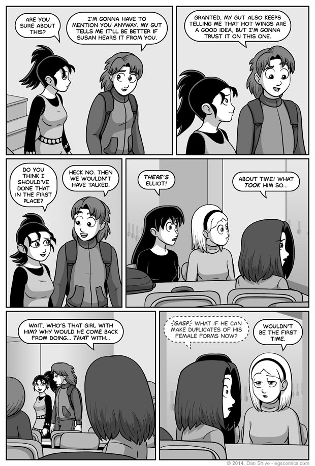 One can safely assume that Tedd has been wondering just where the heck Elliot has been for several minutes and, upon meeting up with Susan and Sarah, informed them of why Elliot was absent. At least, I hope people safely assumed that upon reading this comic. If they didn't prior to seeing the commentary, it means I failed horribly at heavily implying things.