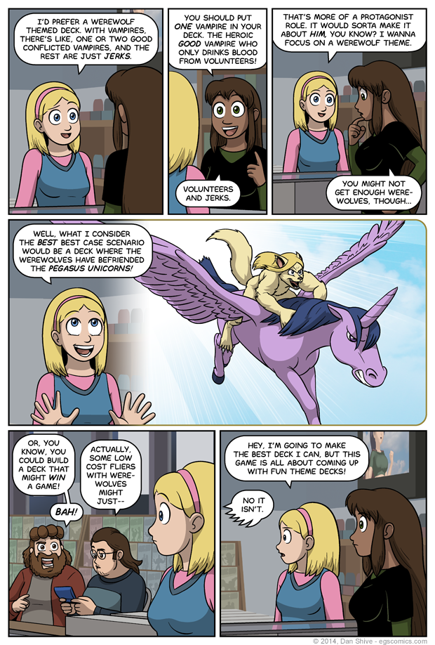 This comic wound up with a lot of rewriting, and I find myself frustrated while writing this commentary because I said elsewhere that I would elaborate on why rewriting occurred, but I can't think of a way to do so without it pretty much amounting to me saying "this is the point of this page", which I hate doing.