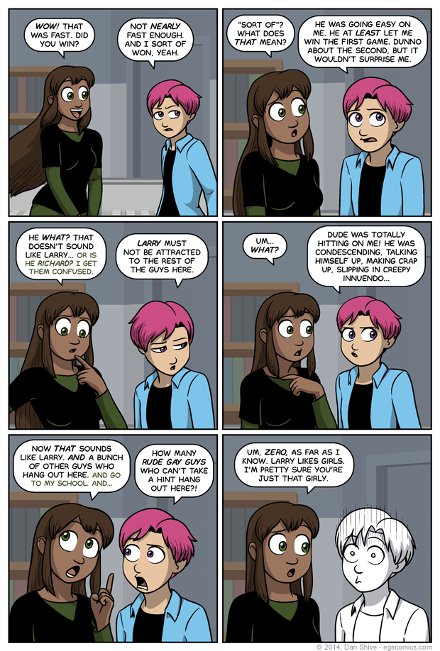 This isn't what was originally going to follow the previous comic, and I consider it a significant improvement for a few reasons. I don't want to go into too much detail as to why, but it wasn't originally going to keep focus on Tedd, which would've been sort of weird. Given that Sarah's basically being tutored and Luke is achieving slow but definite victory while Tedd was up against someone who was letting him win, it makes sense that Tedd finished first.