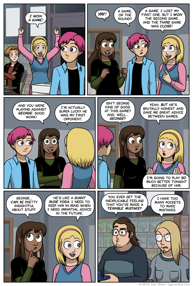 This is essentially the comic that was originally going to follow Tedd's game with Larry, though with some significant changes. For one, Tedd wasn't going to be present at all, and I was instead trying to figure out what Justin's part in the conversation would be. Obviously, I have since decided that Justin is judging from a table by the entrance, but I had originally imagined him behind the counter with Grace.