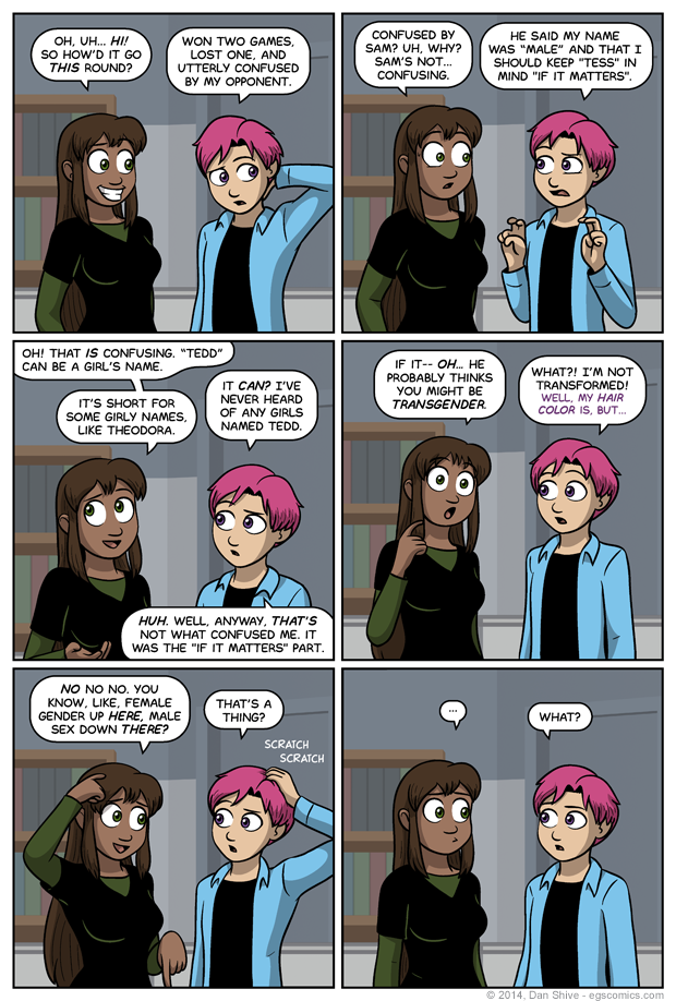 I had never heard of "Tedd" (or "Ted") being a feminine name prior to bringing up the assumption that it was a male-exclusive name in the comic. Since then, I have learned that it can be short for several feminine names, but it's apparently common for people to not be aware of that.