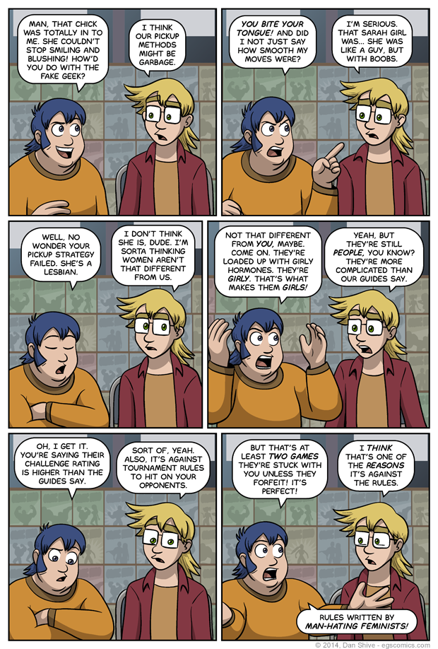 This is yet another one of those comics where I wrote the dialogue to be a bit over the top, and yet I've heard worse and more extreme things said by actual people. Way to upstage me, people who say truly awful things in reality.