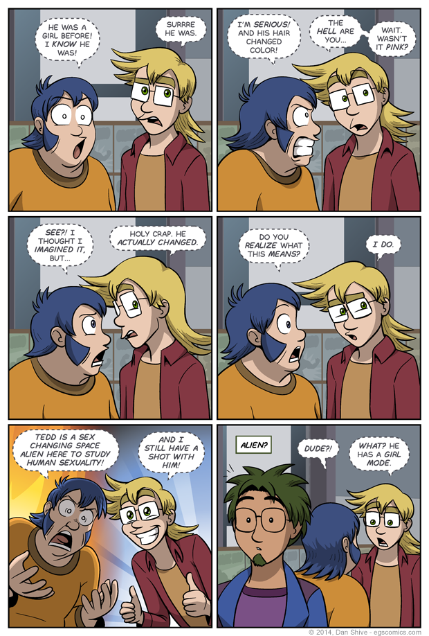 Larry really didn't need much evidence to accept the "Tedd's an alien" theory, did he? It's not that strange, really. Rich and Larry have more in common than ineptitude with talking with women, after all. They believe the truth is totally out there all over the place, and that truth is aliens because shut up what else could it be? Can't think of a better explanation? WELL THAT PROVES IT.
